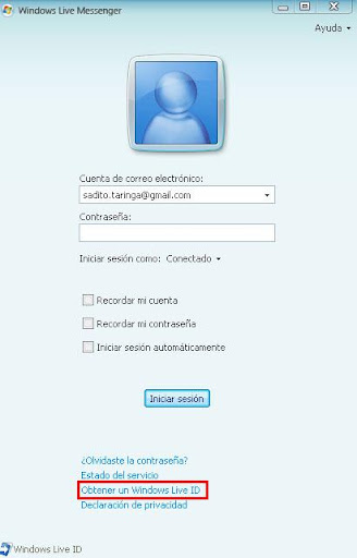 Ahora que ya tenemos nuestra cuenta, hace falta hacer unas cosas para poder usarla con el MSN, abrimos el MSN y abajo de todo hacemos click en donde dice: Obtener un Windows Live ID, o podes entrar desde aca: Obtener un Windows Live ID