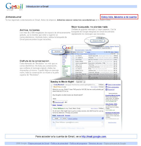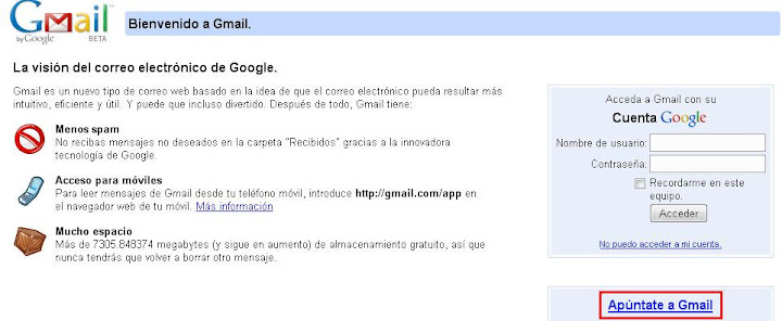 Una vez que entramos a Gmail vamos a donde dice Apúntate a Gmail o hace click aca: Apúntate a Gmail