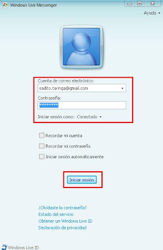 Ahora volvemos a nuestro Msn Messenger, agregamos nuestra cuenta de correo electronico, la contraseña y hacemos click en el boton de Iniciar Sesión