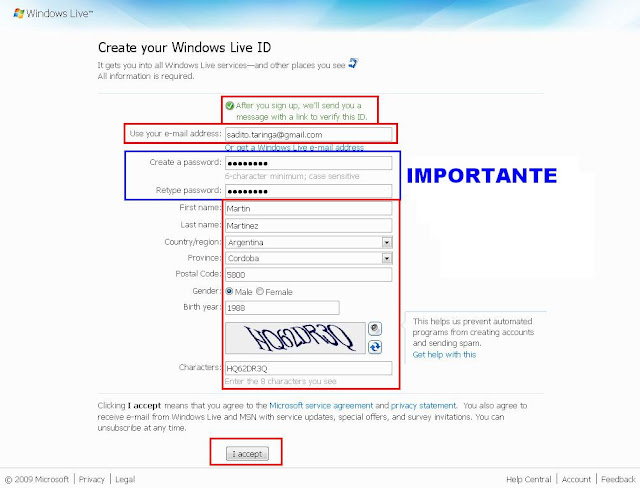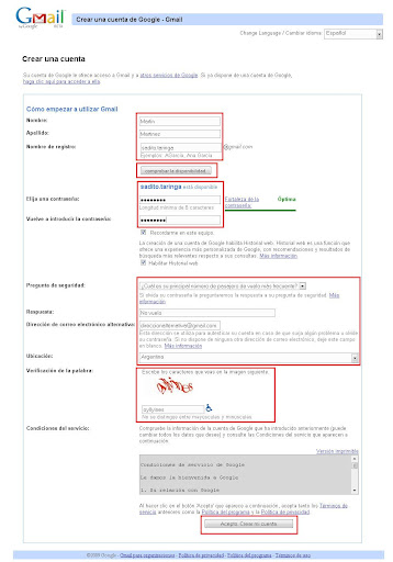 Bueno en esta ventana, lo que tenes que hacer es llenarla con todos los datos, como son, el nombre, apellido, nombre de registro, en el cual ahi pones tu mail, en este caso yo puse sadito.taringa, es importante probar el nombre de la cuenta para no tener que volver a llenar la contraseña ni la imagen de verificacion. Una vez completado todo, hacemos click sobre el boton que dice: Acepto. Crear mi cuenta.