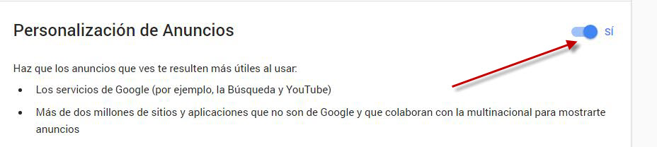 Si quieres que Google deje de enviar la información que sabe sobre ti a los anunciantes, simplemente desactiva la opción “Personalización de anuncios” para que quede en “No”.