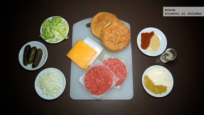 Para la hamburguesa: 2 panes de hamburguesa, 2 hamburguesas de ternera, 1 loncha de queso cheddar, lechuga iceberg, cebolla y pepinillos agridulces.