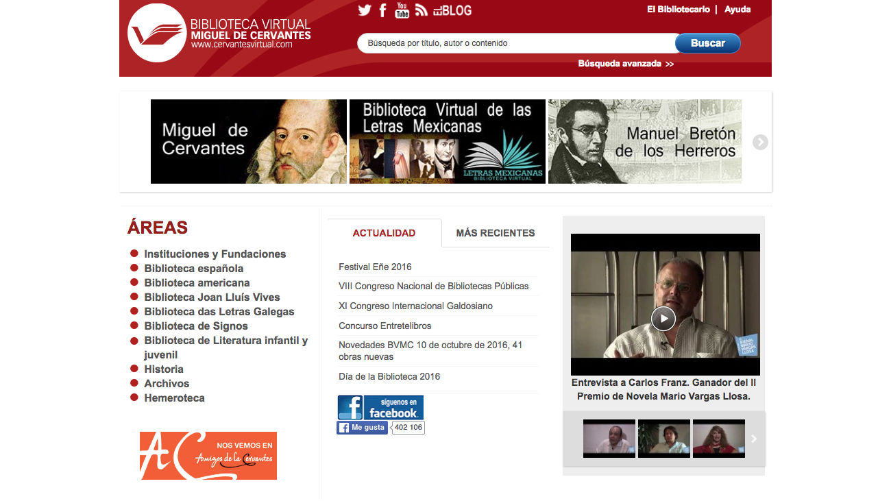 En primer lugar nos quedamos con la de Miguel de Cervantes, una biblioteca virtual especializada en el genio de las letras (aunque, evidentemente, figuran otros autores). Un lugar en la que puedes buscar por título, autor o contenido, pero que también cuenta con filtros de búsqueda avanzada.
