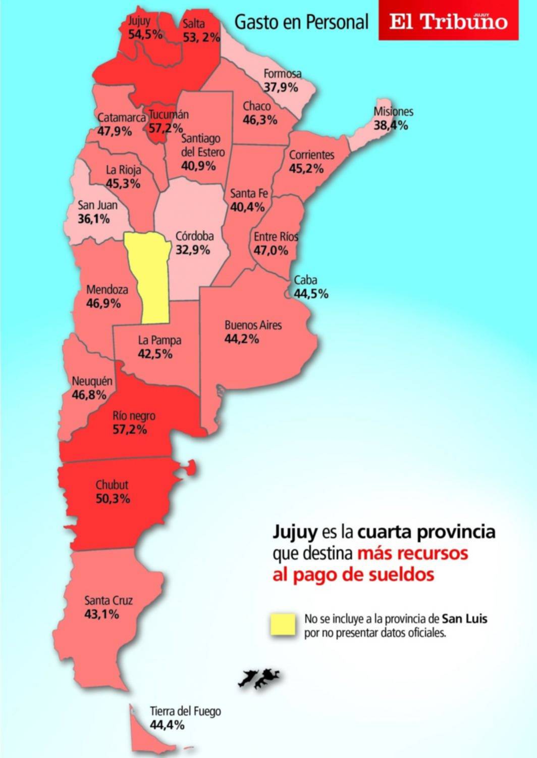 La provincia de Jujuy usa el 54,5% de sus ingresos para el gasto de salarios de empleados públicos, seguida de Chubut 50,3%, Catamarca 47,9 %, Entre Ríos 47,0%, Mendoza 46,9%, Neuquén 46,8%, Chaco 46,3%, La Rioja 45,3%, Corrientes 45,2%, Caba 44,5%, Tierra del Fuego 44,4%, Buenos Aires 44,2%, Santa Cruz 43,1%, La Pampa 42,5%, Santiago del Estero 40,9%, Santa Fe 40,4%, Misiones 38,4%, Formosa 37,9%, San Juan 36,1% y Córdoba 32,9%.